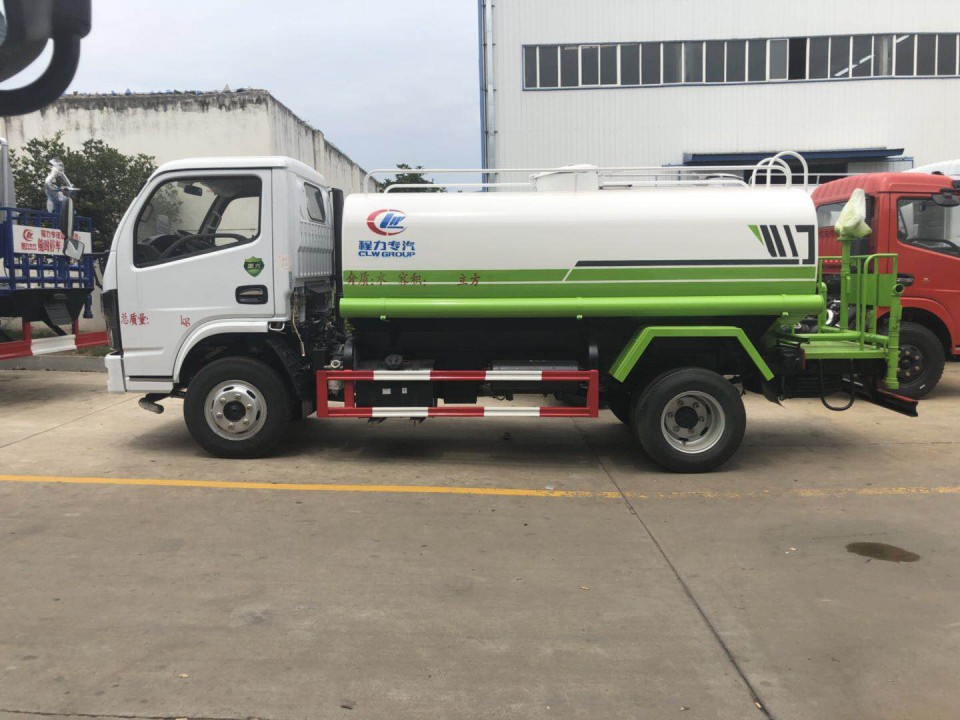 東風5噸灑水車采用東風多利卡底盤,白色可前翻駕駛室,朝柴102馬力國五發動機,5檔變速箱,軸距3308mm,1.8噸前橋,3.5噸后橋,7.00R16原廠鋼絲胎,原廠abs,帶方向助力,離合助力器,氣剎制動。