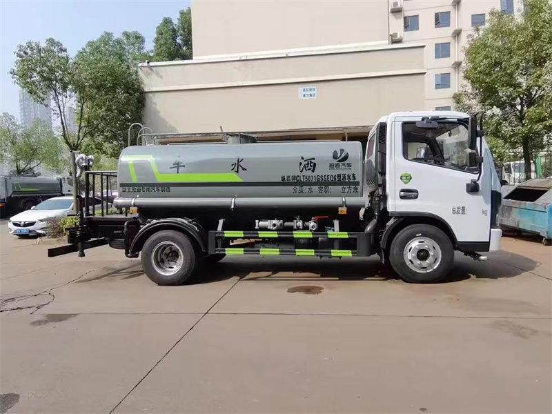 東風多利卡5噸灑水車產品標配前噴 (鴨嘴) 、后沖、后灑、側噴、后置式工作 平臺,平臺上配置綠化水炮 (可 360°旋轉,既可以調成柱狀,也可 以調成霧狀,更可以調成直沖狀、大雨、中雨、小雨、毛毛雨) ,配 備優質大功率專用灑水泵(可自吸自排,可從河里或池塘抽水到罐體), 取力器,雜物過濾網,消防接口, 自流球閥系統、取力器、球閥、濾網 均為國家標準產品,主管道加粗,法蘭墊、法蘭盤加厚,大通徑球閥。 整體具備性能優良安全可靠、效率高、流量大、維修方便等特點。