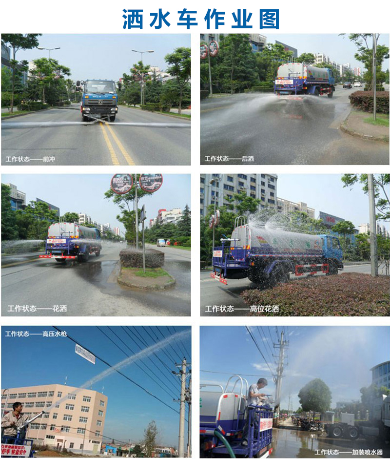 灑水車的配置:前沖,后灑,雙面側噴,單面側噴,高位花灑,綠化高泡,工作平臺,360度全面沖洗;灑水車對水源的要求:灑水車可利用河溝、池塘作為水源,注意吸水管端部全部沒入水中。為避免吸入石塊或較多的泥沙、漂雜物,吸水管端部設有過濾裝置,吸水時嚴禁將過濾裝置拆下;灑水車加引水:灑水車的離心式水泵每次吸水前,必須向水泵內加入一定量的引水,加完后必須關閉加自吸式水泵第一次使用時,需要加引水,以后則不必再加引水;灑水車進水管必需要真空:灑水車吸水時進水管系統必須保持一定的真空度,才能將水吸入箱內。進水管系統務必要密封可靠,軟管不能破損,硬管不能有裂紋,否則將產生漏氣現象,也就造成吸不上水的情況;灑水車停車掛檔灑水車:無論是在吸水前,還是在灑水前,取力裝置掛檔都必須在停車時進行; 灑水車冬季放水:冬季來臨前部分較冷地區,應將灑水車的水泵和水管內的水放空,以防凍裂和損壞; 灑水車的潤滑與緊固: 在使用過程中要定期潤滑傳動總成各潤滑點,經常緊固聯結點,以保證正常使用; 灑水車定期排污:灑水車貯水箱設有排污管,該管的進口為水箱的最低點。經過一段時間的使用,應定期打開排污管開關,將罐內積存的雜物排除,直到水變清為止。