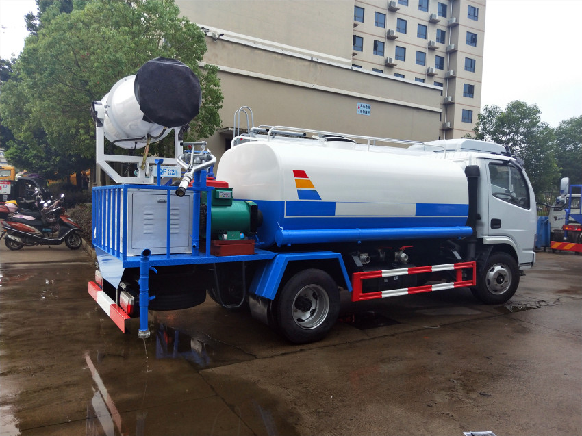 東風5立方多功能抑塵車|霧炮車,霧炮車又名多功能遠程噴霧抑塵車、降塵車,廣泛用于礦區、拆房工地、煤礦場、鋼廠等降塵、降溫。是一種通過高壓泵將噴霧噴灑到空氣中,來吸附各種大小灰塵顆粒,從而對粉塵、霧霾等惡劣污染環境,進行有效控制的新型專用汽車,相比于常規降塵設備,它具有良好的機動性、高效性,適用范圍更廣,工作效率也更高。 底盤配置:采用東風D6新一代多利卡原裝底盤,玉柴115馬力/朝柴102馬力/云內115馬力,國五排放發動機,3308軸距,5檔變速箱,7.00R16鋼絲胎,ABS,方向助力,空調,電動門窗,中控鎖,上裝配置:罐體容積:4.5立方(裝水4.5噸),罐體鋼板采用Q235碳鋼鋼材,前沖后灑、側噴、平臺高炮、自流閥及消防接頭各1個、水管2根、標配億豐泵或金龍泵,霧炮機可選裝20-35米. 選裝配置:藥盤,室內氣控操作,大鴨嘴1對,本田泵,加炮,長警燈,罐側帶閘門,罐后加裝噴霧裝置,威龍小泵/大泵,LED箭頭燈;全車大通徑球閥;罐體內部也可選擇防銹、防腐等處理,帶前部沖洗路面噴灑裝置、后部扇形降塵噴灑裝置,兩側面噴灑裝置,帶后部工作平臺、平臺上安裝綠化灑水炮(炮噴射形狀可調),可調直沖狀、大雨、中雨、毛毛雨,可連續調節,射程可達28米,垂直吸程6.5米,揚程14米,另加裝高效率車載式風送噴霧機,噴藥炮霧化效果好,可遠程噴霧,水平射程達25米。帶消防接口、自流閥,可自吸自排。