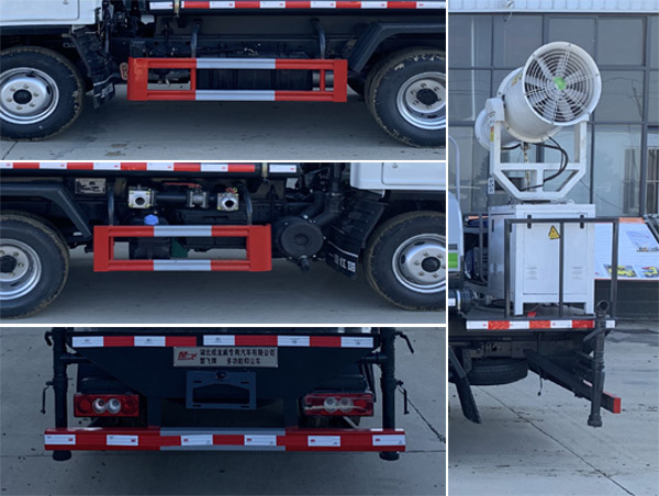 該車用途為抑塵降霾,主要裝置為水泵與風機;罐體有效容積:1.91立方米,罐體外形尺寸(mm) 為2200×1370×940;側、后防護材料為Q235,連接方式為螺栓連接,后防護斷面尺寸(mm):100×50, 后部防護離地高度(mm):350;ABS型號為CM4YL,生產廠家為廣州瑞立科密汽車電子股份有限公司. |