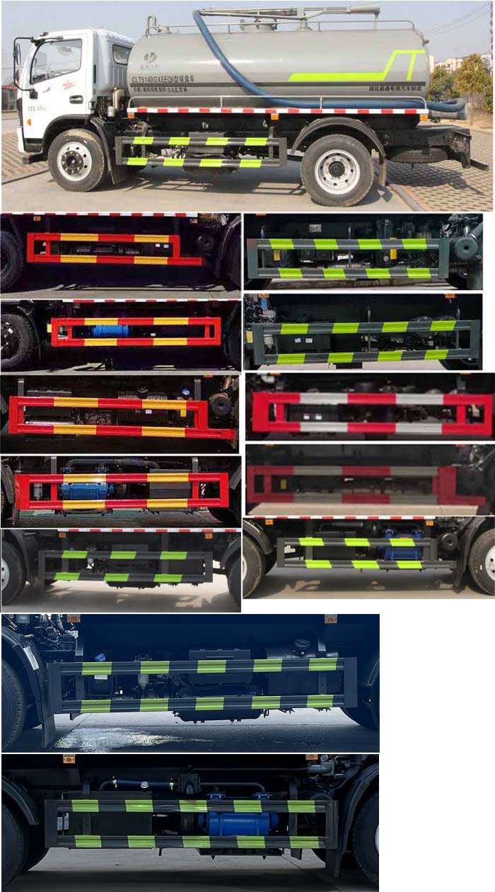 該車主要專用裝置:罐體及吸糞裝置,主要用于抽排運污水、糞便、泥漿等液態污物;罐體總容量9.98立方米,罐體有效容積9.5立方米,罐體外形尺寸(長×長軸×短軸)(mm):4200×2100×1500;ABS型號/廠家:ABS型號:ABS/ASR-24V-4S/4M,廠家:襄陽東風隆誠機械有限責任公司;側、后防護材料均為:Q235碳鋼,連接方式均為螺栓連接,后部防護截面尺寸(mm):120×50,后部防護離地高度(mm):460;僅采用底盤3800mm軸距改裝.隨底盤選裝駕駛室,選裝電瓶,油箱位置.隨底盤選裝限速裝置,車速89km/h.