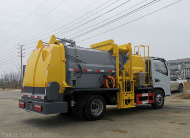 東風(fēng)小多利卡餐廚垃圾車改裝容積4~5m3,罐體厚度4.75mm,配備掛桶提升機(jī)構(gòu),后蓋液壓開啟,罐體可以舉升自卸,尾部帶自流閥。