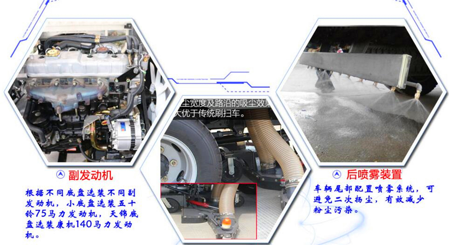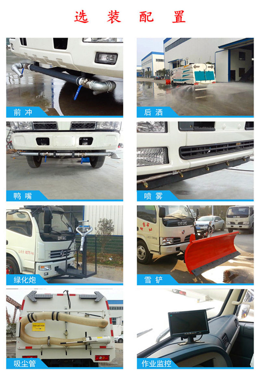 東風(fēng)8方洗掃車采用東風(fēng)型國五二類底盤改裝,加裝副發(fā)動(dòng)機(jī)、風(fēng)機(jī)、高壓水泵、清水箱、垃圾箱、左右立掃、帶噴水桿的寬吸嘴、低壓沖洗系統(tǒng)、垃圾箱自潔,掃盤降塵系統(tǒng),液壓系統(tǒng)、專用裝置電控系統(tǒng)和副車架等改裝而成: