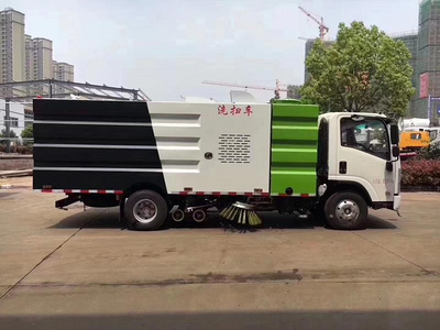本洗掃車采用重慶五十鈴(700P)型國5二類底盤改裝,加裝副發(fā)動(dòng)機(jī)、風(fēng)機(jī)、高壓水泵、清水箱、垃圾箱、左右立掃、帶噴水桿的寬吸嘴、低壓沖洗系統(tǒng)、垃圾箱自潔,掃盤降塵系統(tǒng),液壓系統(tǒng)、專用裝置電控系統(tǒng)和副車架等改裝而成: