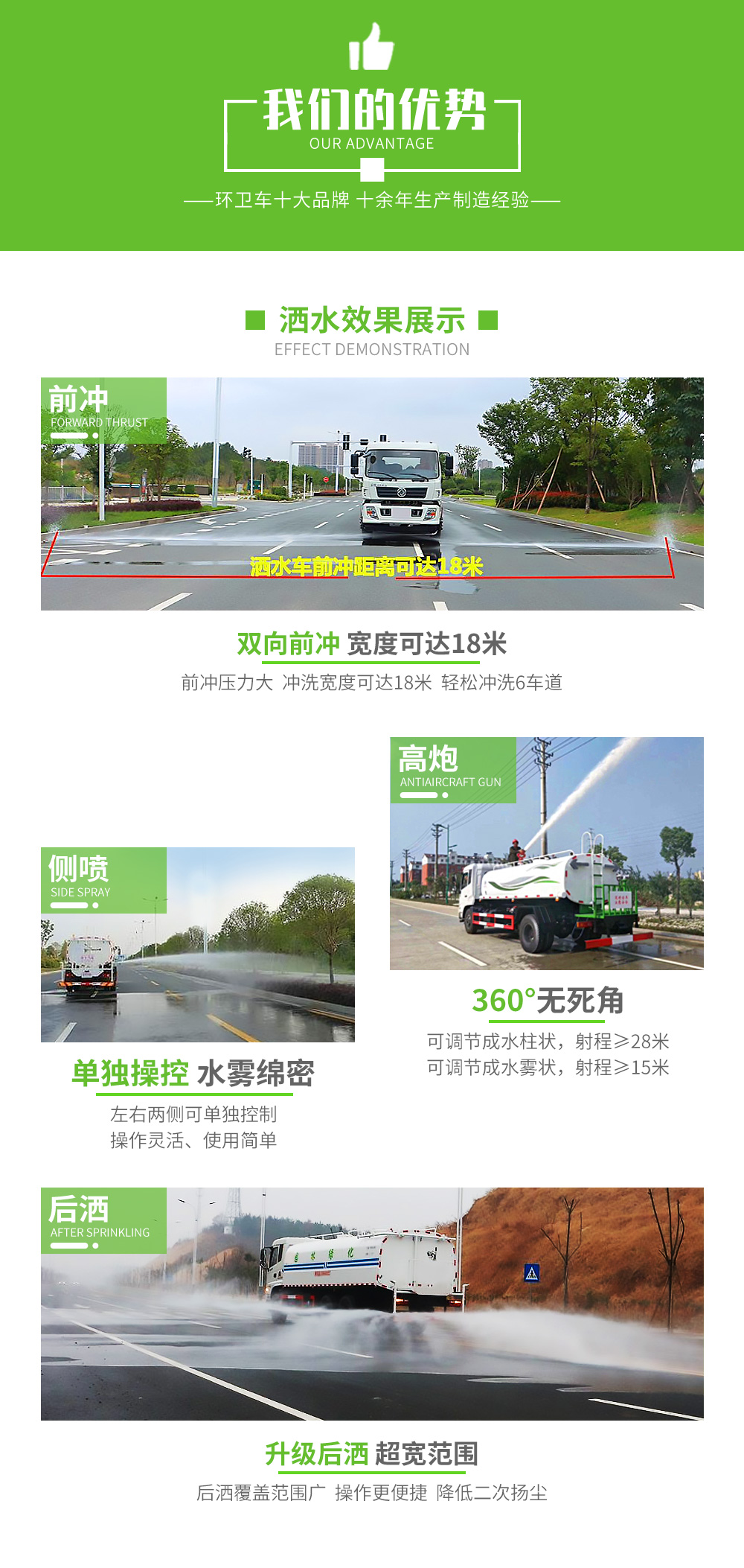 上裝配置:罐體滿載容積12立方,前噴,后灑,側(cè)噴,高炮,帶工作平臺(tái),平臺(tái)加裝80米風(fēng)筒式霧炮,配備柴油發(fā)電機(jī)組,霧炮可作為噴射農(nóng)藥,抑塵功能。