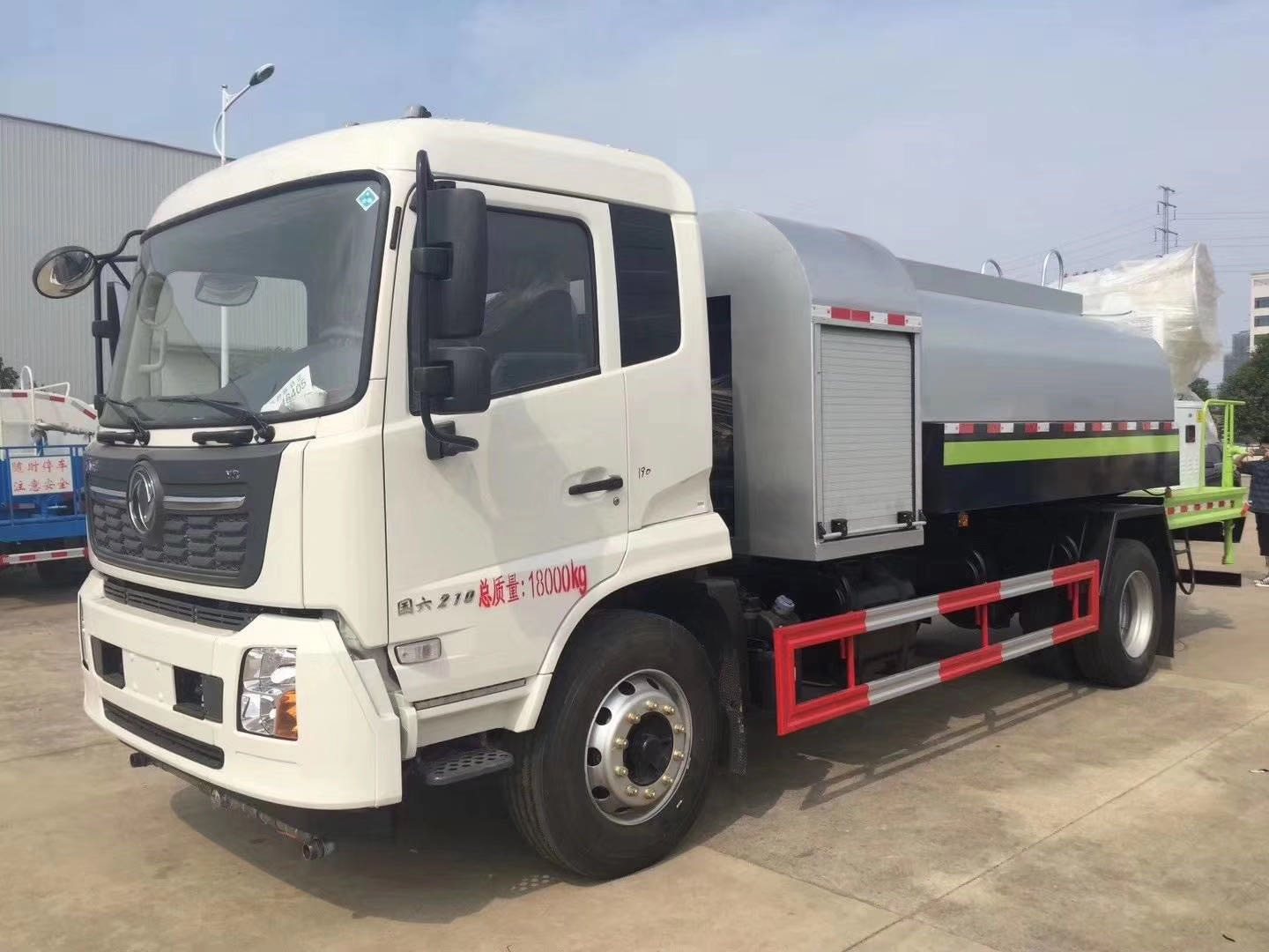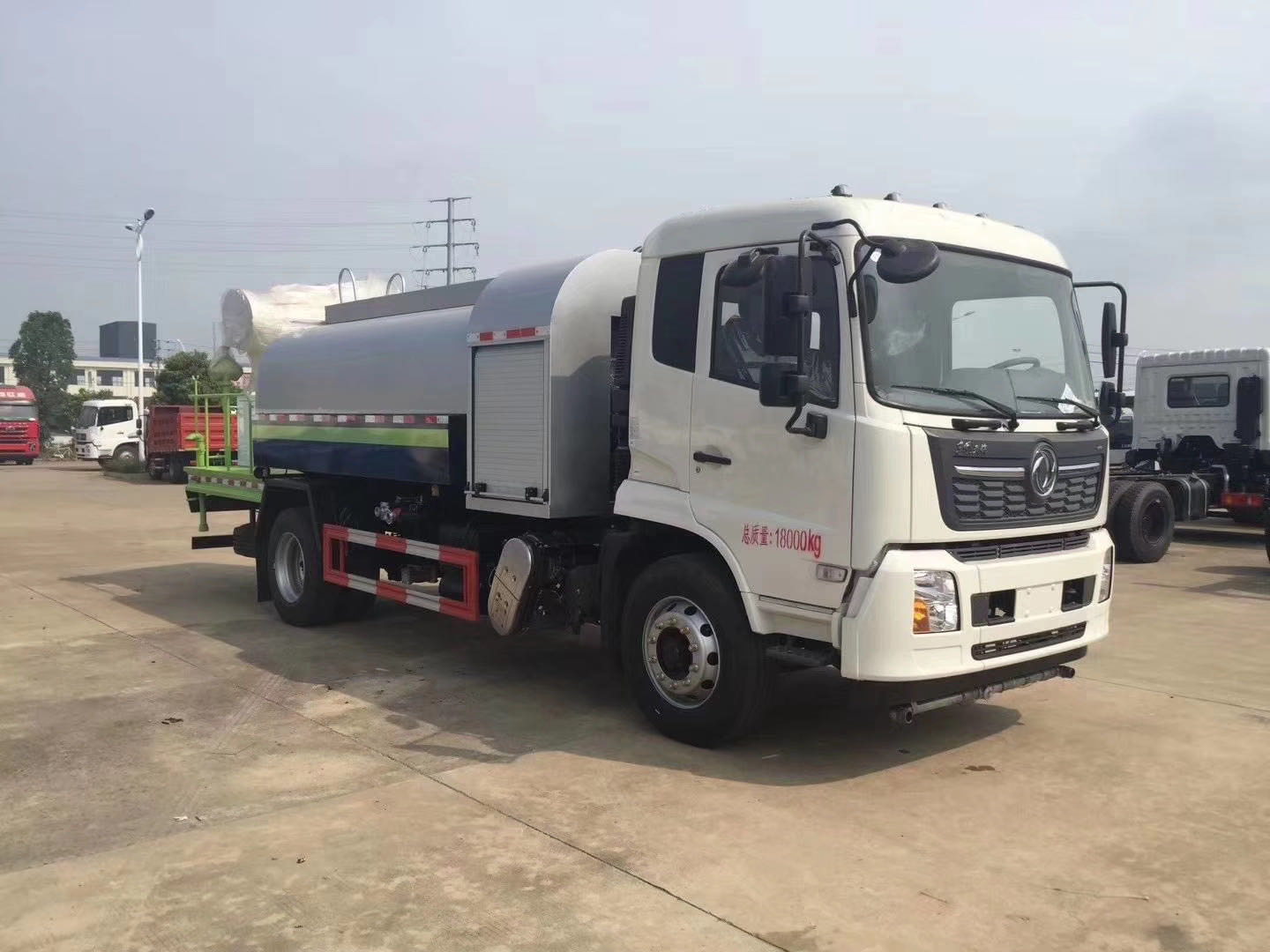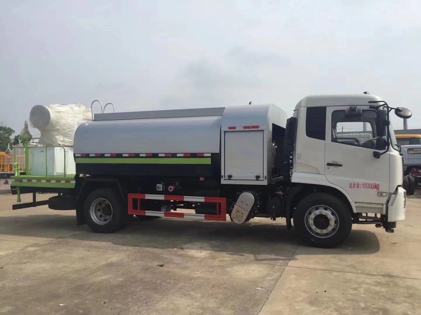 整車說明:專用裝置為抑塵霧炮,用于城市抑塵。整車長/軸距/后懸對應關系為(mm):7890/3950/2540;8300/4200/2700;8700/4500/2800;9150/4700/3050;9150/4700/3020;9600/5000/3200;9900/5300/3200;10250/5800/3050.防護材料:Q235A碳鋼,連接方式:左右側面采用焊接連接。后下部防護采用螺栓連接,后部防護斷面尺寸(mm):120×50,后部防護離地高度(mm):490。ABS型號/生產廠家:3631010-C2000/東科克諾爾商用車制動系統(十堰)有限公司,ABS 8/東科克諾爾商用車制動系統(十堰)有限公司, 4460046450/威伯科汽車控制系統()有限公司。隨底盤選裝駕駛室。選裝霧炮型號:WF-60/WF-80/WF-100所對應的整備質量分別為:9650kg/10600kg/11300kg。選裝外形圖片。
